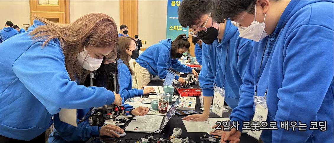 1일차에는 본사에서 교육장소로 이동해 오리엔테이션, 신입사원 환영식과 함께 '한솔의 미래와 비전'에 대한 강의를 들었습니다. 그리고 1조부터 10조까지 팀명을 정하고 서로 소개하는 팀빌딩 시간을 가졌습니다. 2일차에는 ‘V-log페스티벌 OT’, ‘V-log페스티벌 기획’, ‘로봇으로 배우는 코딩’, ‘선배와의 면담’, ‘지도선배의 하루’, ‘브이로그 제작’을 진행했습니다.