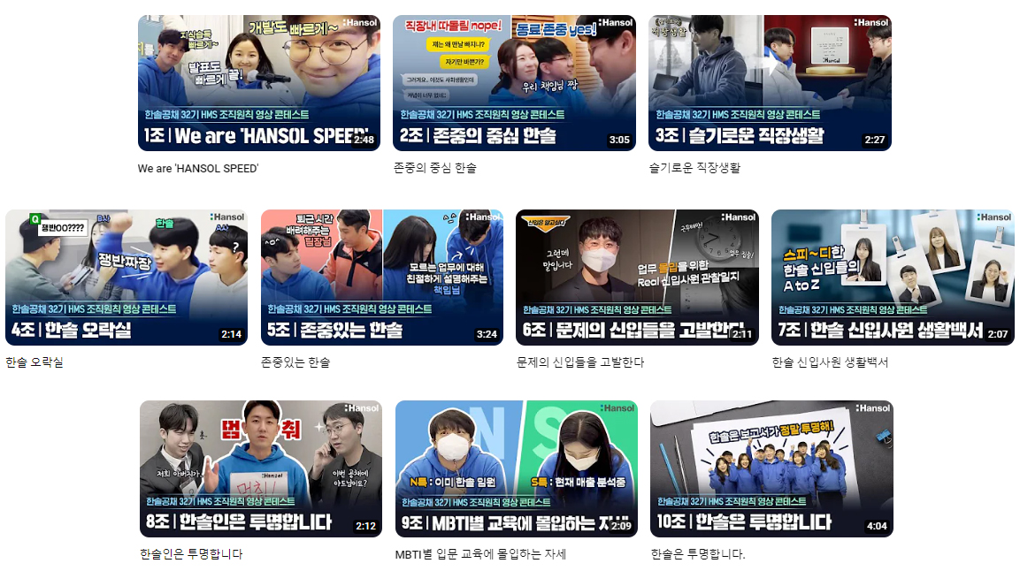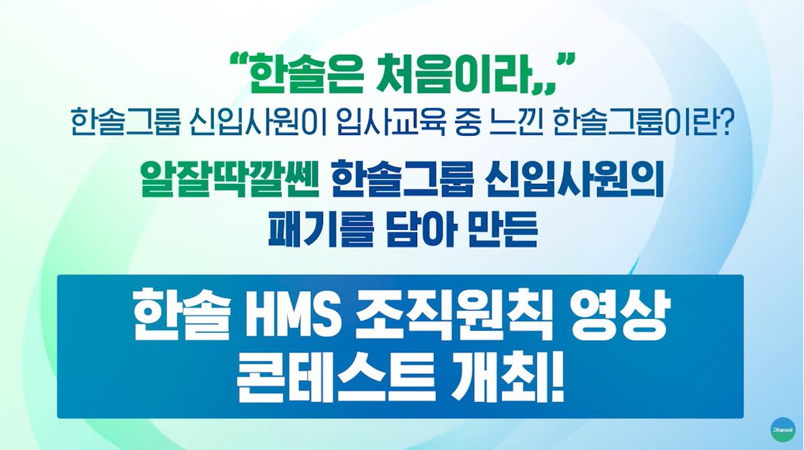 한솔그룹 신입사원이 입사교육 중 느낀 한솔그룹에 대해 알잘딱깔쎈(알아서 잘 딱 깔끔하고 센스있게) 한솔그룹 신입사원의 패기를 담아 만든 한솔 HMS 조직원칙 영상 콘테스트를 개최합니다. 한솔그룹 유튜브에서 그룹별 영상을 시청하고 좋아요와 댓글로 투표해 주세요. 콘테스트 기간은 2월 20일부터 27일까지입니다.