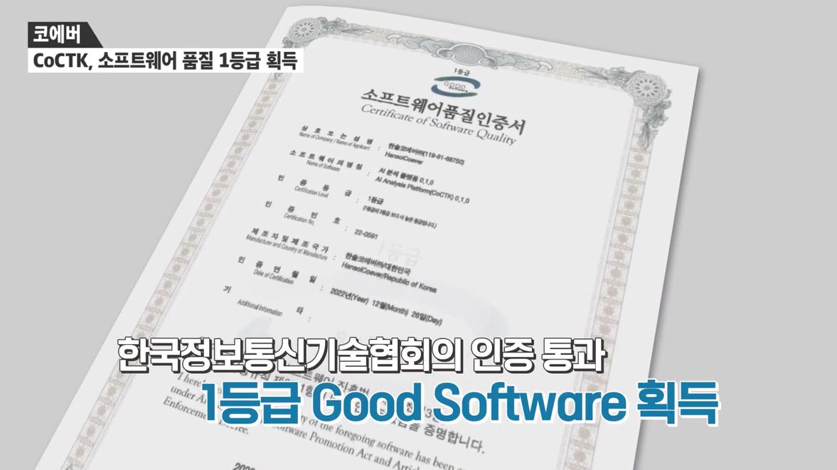 CoCTK가 획득한 한국정보통신기술협회의 소프트웨어품질인증(GS인증)은 제품의 품질을 종합적으로 평가해 일정 수준 이상의 제품에 부여하는 국가 인증으로 코에버의 AI 분석 플랫폼의 성능과 품질에 대해 공인 기관으로부터 그 우수성을 인정받은 사례로 기록되었습니다.
