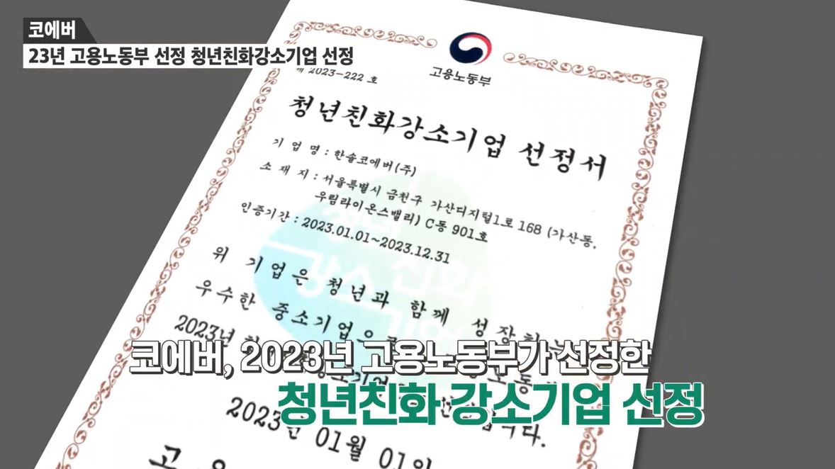 한솔코에버는 2023년 고용노동부가 선정한 청년친화강소기업에도 선정됐습니다. 청년친화강소기업이란 강소기업 선정 요건을 갖추고 있으면서 임금, 워라밸, 고용 안정이 우수하여 청년들이 근무할 만한 중소기업을 말합니다.