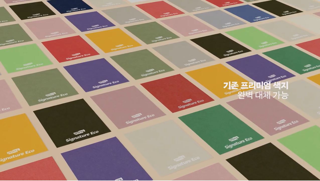 인스퍼 시그니처 에코는 한솔제지가 국내 최초로 만든 재생펄프 함유 프리미엄 친환경 색지입니다. 재생펄프를 100% 함유한 '시그니처 에코 100'과 30% 함유한 '시그니처 에코 30'으로 구성되어있으며, 고객 니즈에 따라 재생펄프 함유량 조절이 가능합니다.