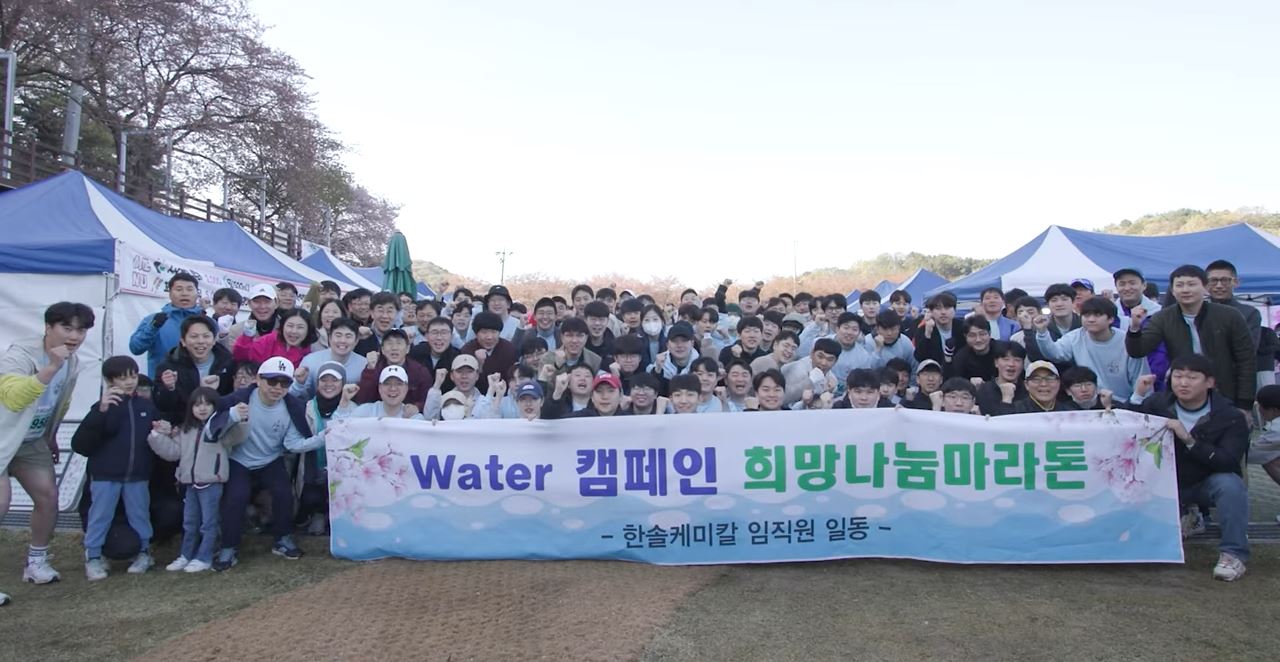 워터캠페인은 지구촌의 식수 문제 개선을 위한 후원 캠페인으로 2016년부터 NGO 팀앤팀과 함께 식수를 지원하고 위생을 개선함으로써 보건복지를 향상하기 위해 매년 희망나눔마라톤에 참여하고 있습니다. 지금까지 케냐 타나리버 지역과 투르카나 지역에서 안전한 식수와 위생환경이 없는 마을과 학교를 중심으로 식수위생 지원 사업을 수행하여 10,000명의 사람들에게 깨끗하고 안전한 식수위생 환경을 제공했습니다. 올해는 처음으로 한솔케미칼 전주공장, 울산공장과 함께 자회사인 ㈜솔머티리얼즈, ㈜테이팩스까지 역대 최대 인원이 참가, 가장 큰 기부금이 모였습니다.