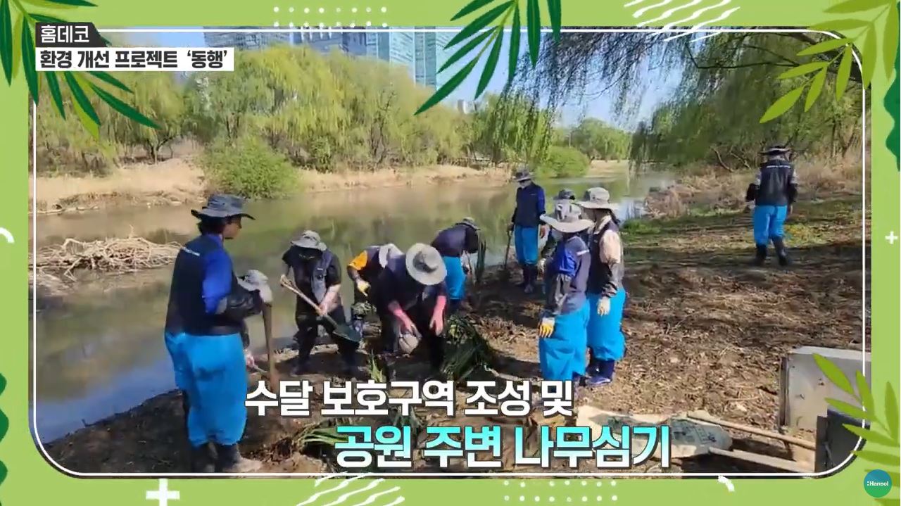 한솔홈데코는 ESG 경영 활동의 일환으로 환경 개선 프로젝트인 동행을 실천하고 있습니다. 올해에는 우리나라 1호 생태공원인 여의샛강 생태공원에서 수상 생태계를 조성하는 활동을 진행할 계획입니다. 이에 앞서 지난 5월 7일에는 수생식물 심기 등 붓꽃을 주제로 하는 서울의 유일한 생태공원인 창포원을 개선했습니다. 향후 수달 보호구역 조성 및 공원 주변 나무 심기 등의 지속적인 봉사를 통해 생태공원에 서식하는 곤충과 양서류의 종을 늘리고 인근 경관을 개선해 나갈 계획입니다.