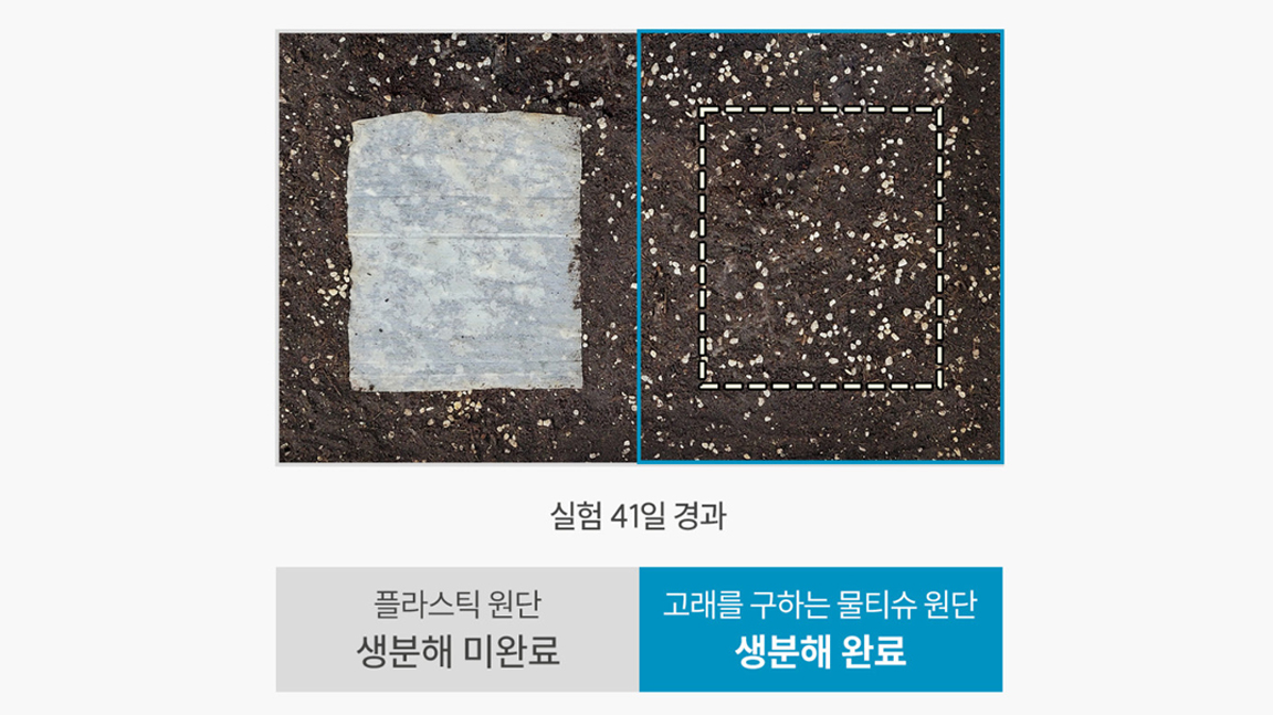 한솔제지의 고래를 구하는 물티슈는 국제물풀림기준(INDA ADANA)을 통과한 플러셔블 원단을 사용해 물이나 미생물에 의해 자연 분해가 되도록 개발되었습니다.