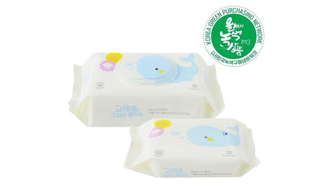 한솔제지의 '고래를 구하는 물티슈' 제품이 2023 대한민국 올해의 녹색상품에 선정됐습니다. 올해 14회째로 맞이한 대한민국 올해의 녹색상품은 상품의 환경개선효과를 전국 16개 소비자·환경단체가 직접 평가해 뽑는 최고의 녹색상품으로 올해는 59개의 제품이 선택되었습니다.