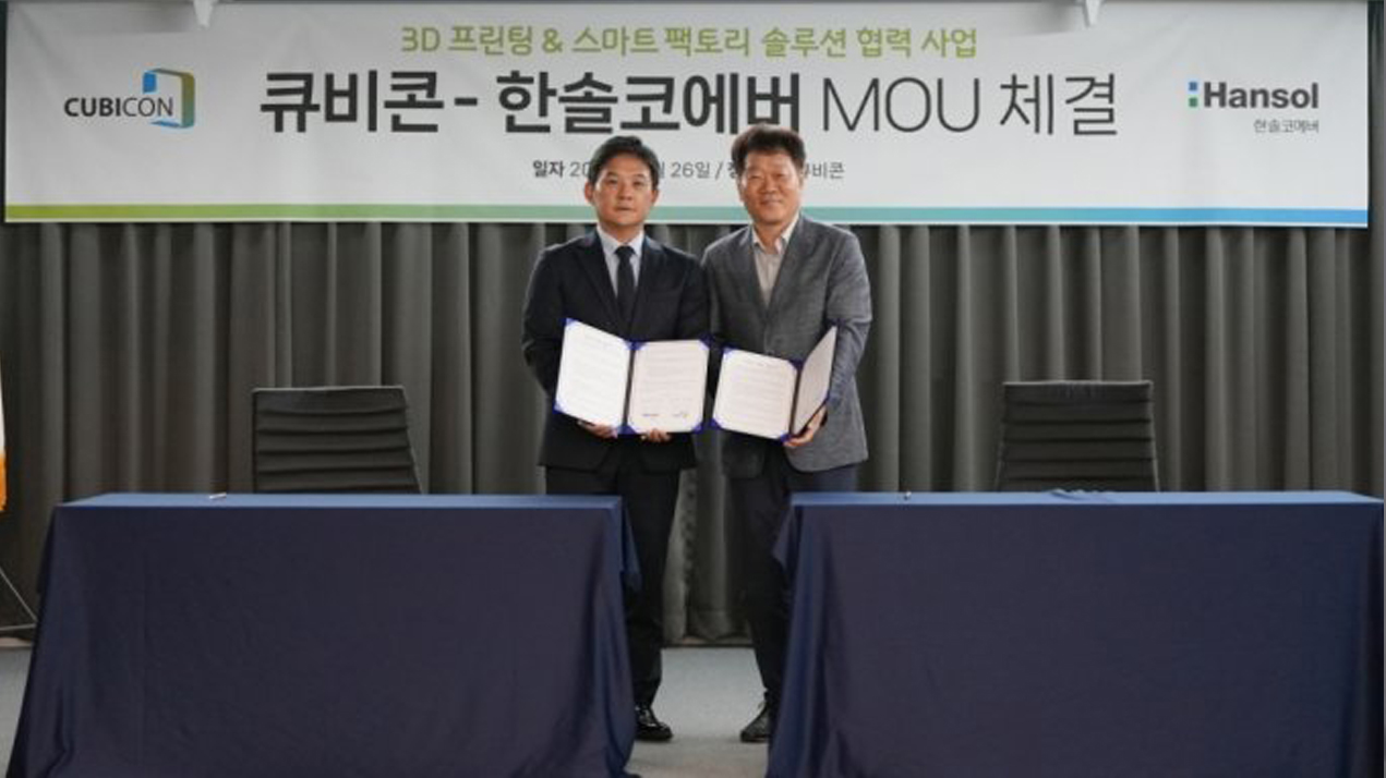한솔코에버가 지난 7월 3D 프린터 제조 기업 큐비콘과 '3D 프린팅 & 스마트 팩토리 솔루션 협력 사업' MOU를 체결했습니다. 이번 협약을 통해 양사는 각사가 보유한 스마트팩토리 솔루션과 산업 분야 3D프린팅을 결합해 새로운 제품 및 서비스를 개발할 계획입니다.