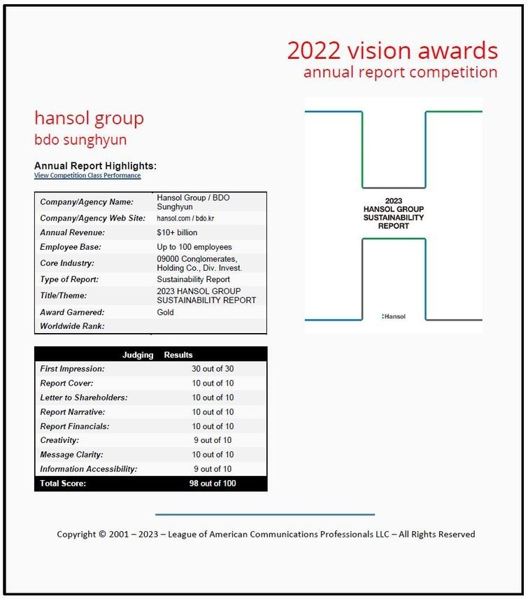 한솔그룹 지속가능경영보고서는 LACP의 심사 항목 중 디자인, CEO메시지, 기술방식 등의 항목에서 높은 점수를 받아 100점 만점에 98점의 점수를 받았습니다.