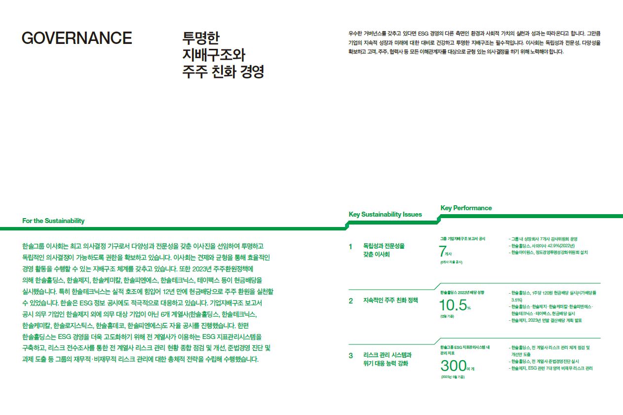 한솔그룹 지속가능경영보고서에서 두드러지는 파트 중 하나는 ‘투명한 지배구조와 주주 친화 경영’입니다. 한솔그룹의 최고 의사결정 기구인 이사회는 견제와 균형을 통해 효율적인 경영 활동을 수행할 수 있는 지배구조 체계를 갖추고 있어 투명하고 독립적으로 의사결정을 합니다. 2023년에는 주주환원정책에 따라 한솔홀딩스, 한솔제지, 한솔케미칼, 한솔피엔에스, 한솔테크닉스, 테이팩스 등이 현금배당을 실시했습니다.