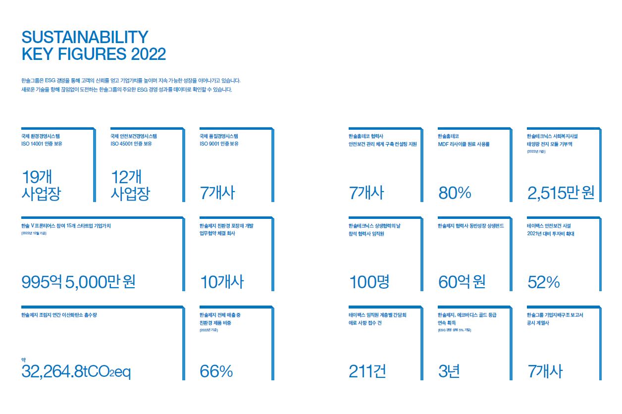 한솔 V 프론티어스 참여 15개 스타트업의 기업가치 995억 5,000만 원, 한솔제지 조림지 연간 이산화탄소 흡수량 약 32,264.8tCO2eq, 한솔제지 전체 매출 중 친환경 제품 비중 66%, 한솔제지 협력사 동반성장 상생펀드 60억 원, 한솔홈데코 MDF 리사이클 원료 사용률 80%, 한솔테크닉스 사회복지시설 태양광 전지 모듈 기부액 2,515만 원, 테이팩스 임직원 계층별 간담회 애로 사항 접수 건 211건 등 다양한 ESG 활동 내역을 수치로 명확하게 전달하고 있습니다.
