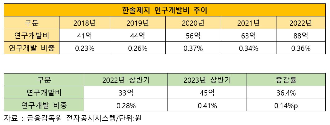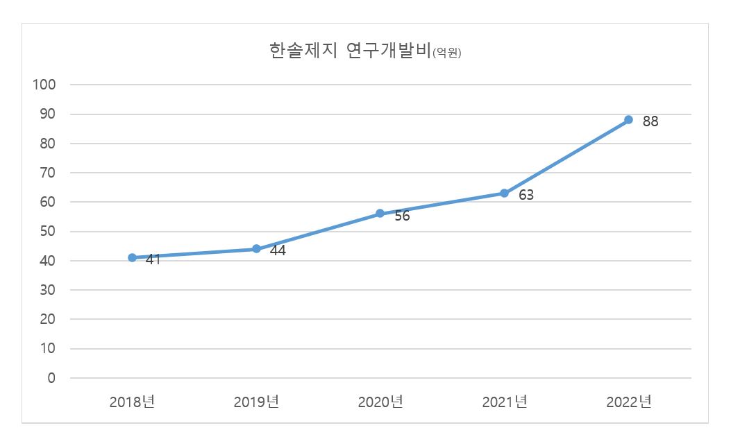 한솔제지의 연구개발비는 2019년 44억 원, 2020년 56억 원, 2021년 63억 원, 지난해 88억 원으로 늘었습니다. 또한 올해는 상반기에만 이미 45억 원을 지출해 지난해 상반기 33억 원에 비해 12억 원이 더 많아져 연구개발 비중이 0.41%에 이르렀습니다.